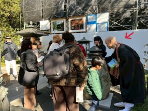 がゆっくり足を止めてお話を聞いてくださいました。仏殿が修復中なのを見てがっかりしていた方も、歩さん(注、障害当事者スタッフ)の説明を聞きながらブロンズ模型に触れて笑顔で帰っていかれました。「今日ここに来てラッキーでした!」「貴重なお話をありがとう」などの言葉をいただいて嬉しくなりました。外国からのお客様もたくさんいらっしゃいましたが、歩さんによる英語での説明が大好評でした。やはりお話をして初めて伝わることが多いのを再認識した1日でした。(S.K.)